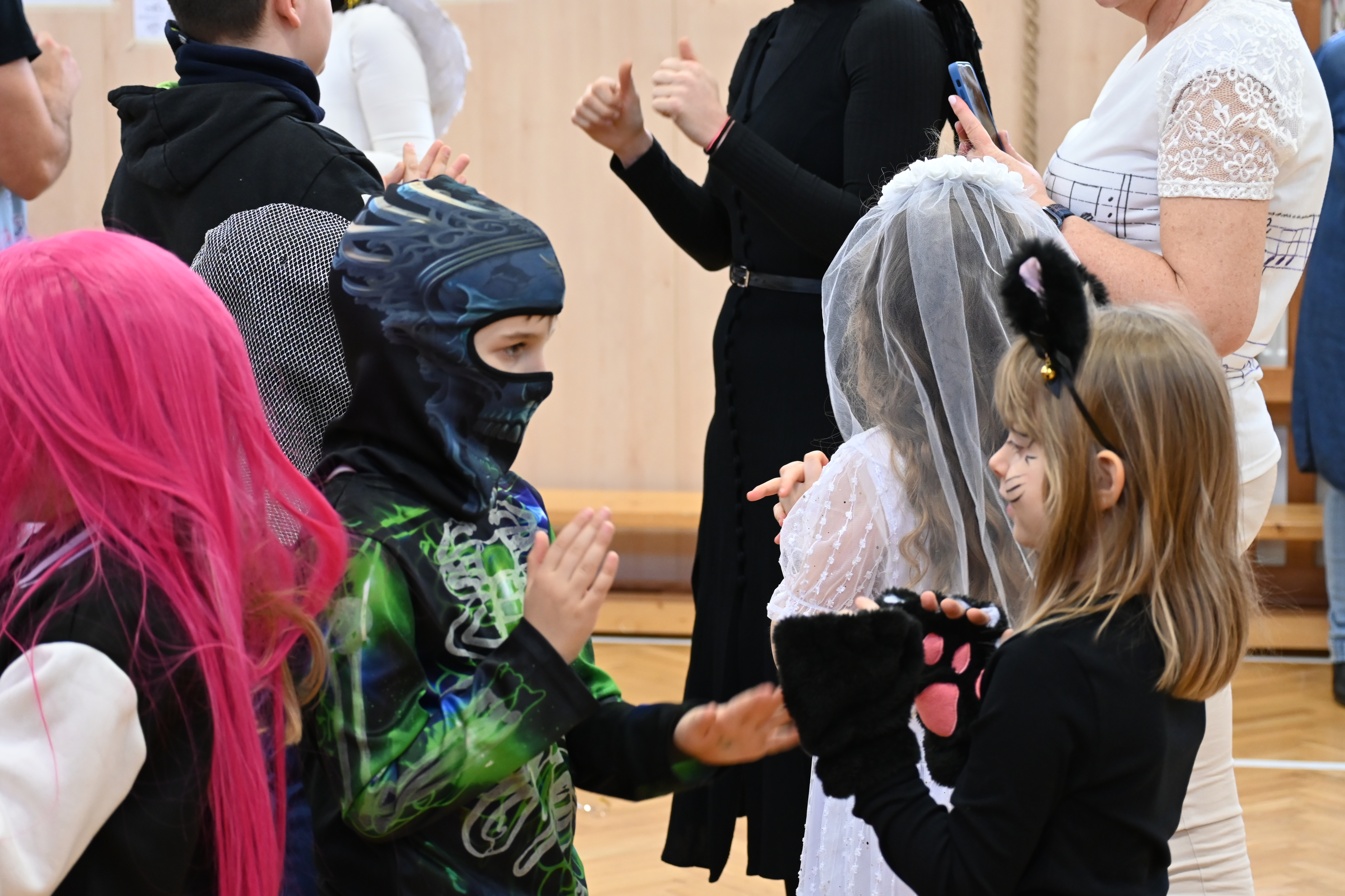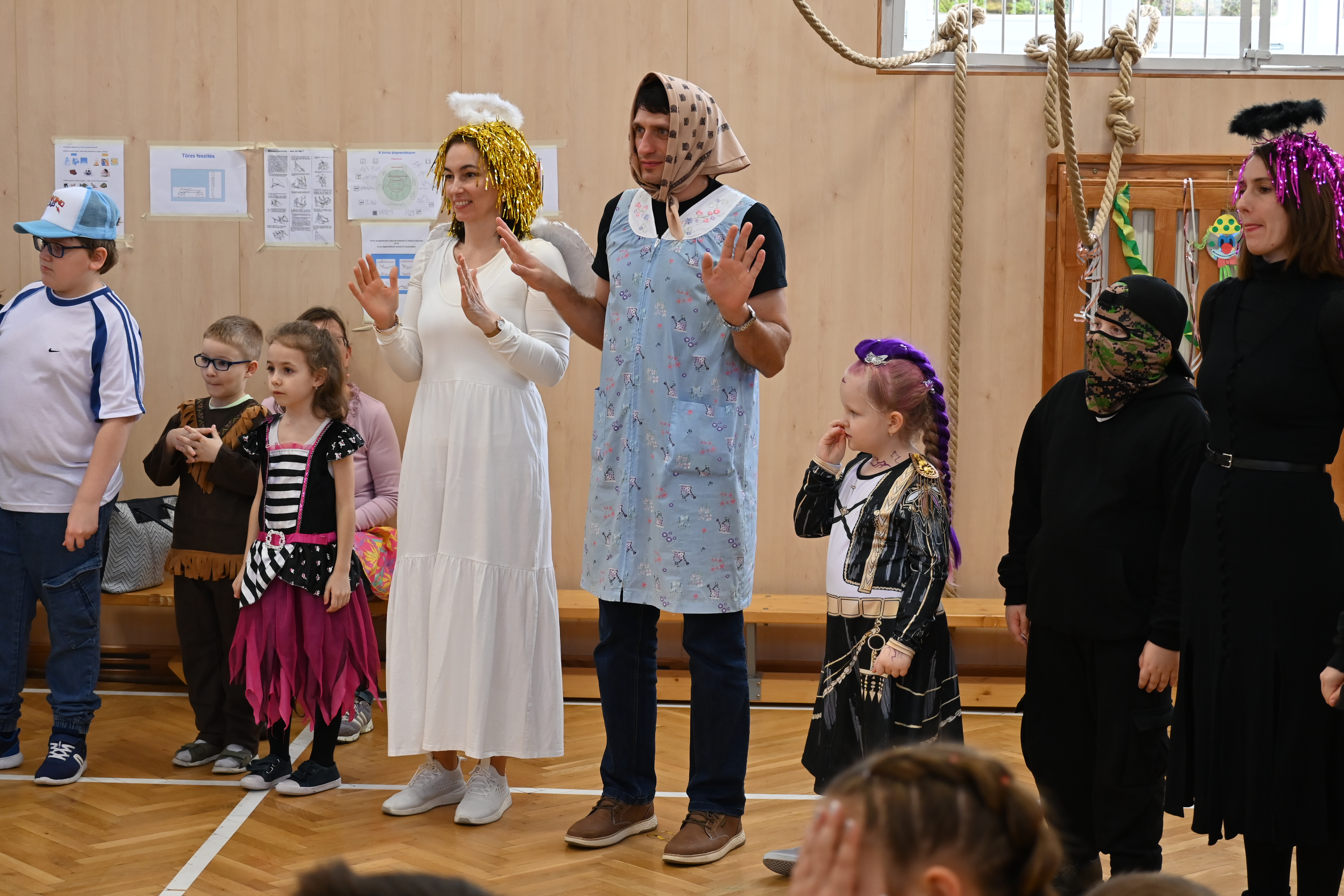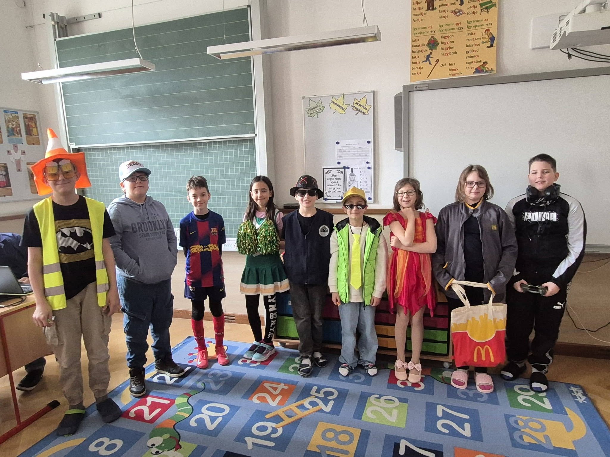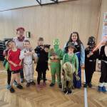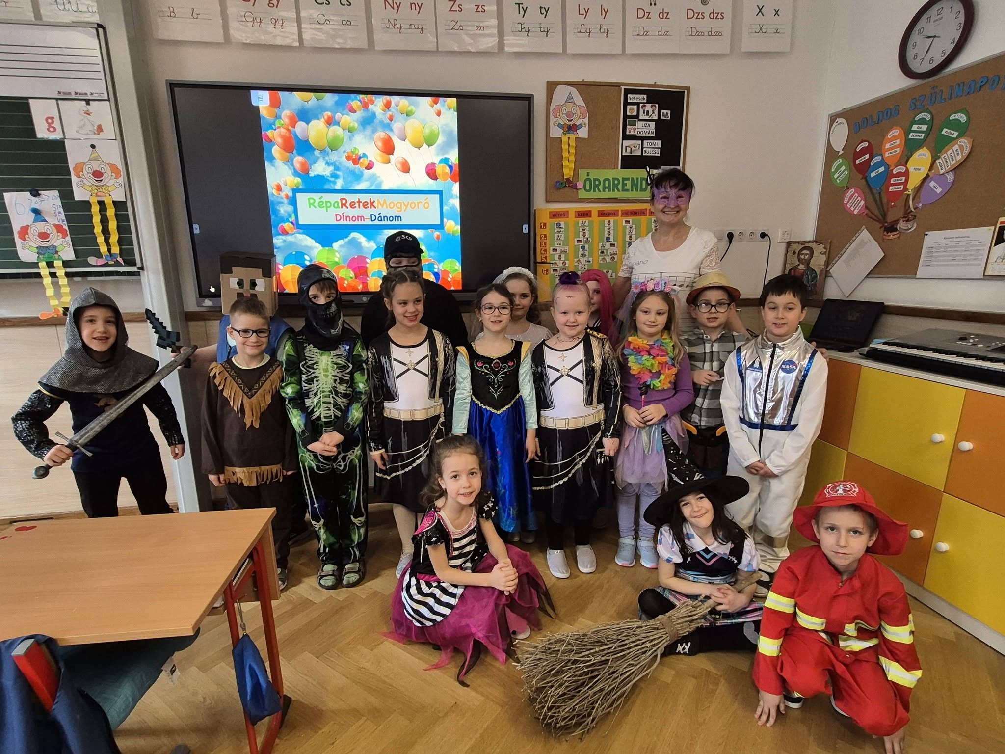 A gyerekek már reggel jelmezbe öltözve érkeztek, így az iskola folyosóit, tantermeit színes, ötletes és kreatív maskarások töltötték meg.