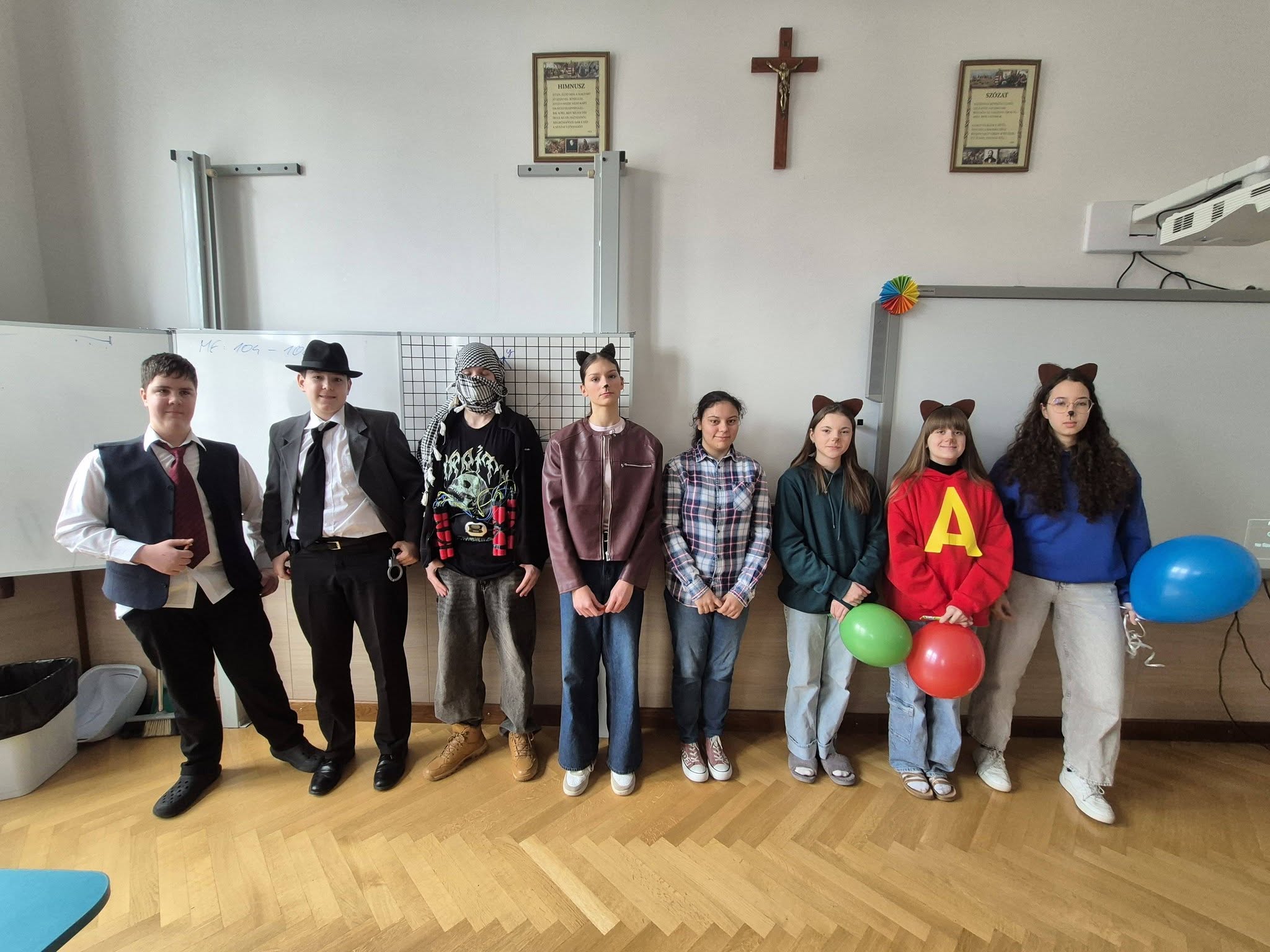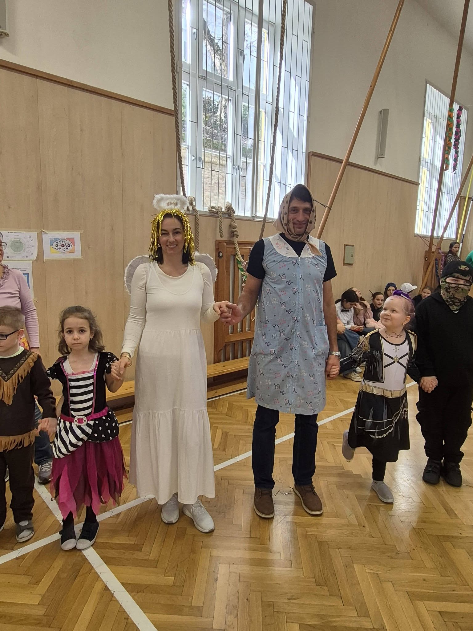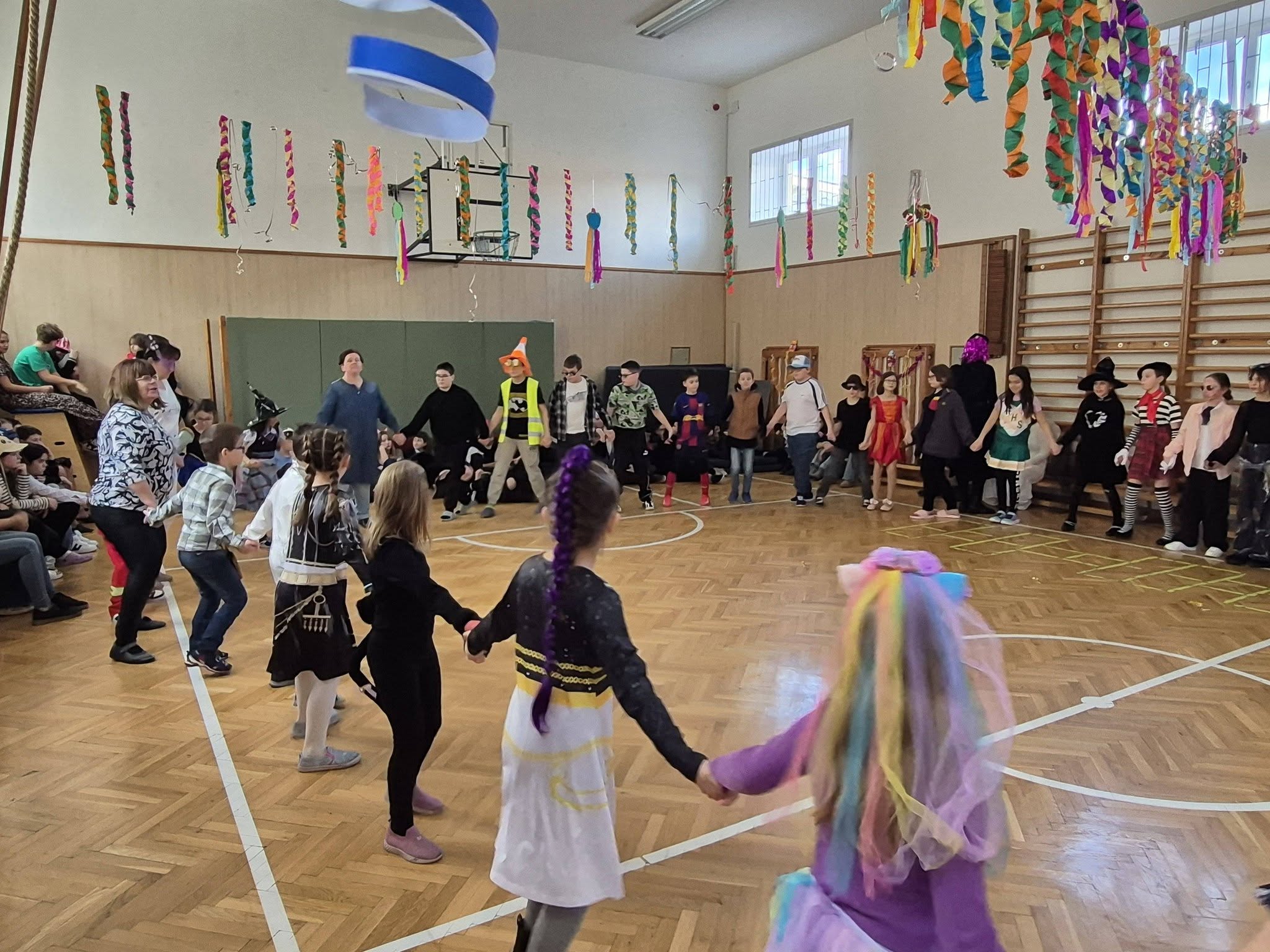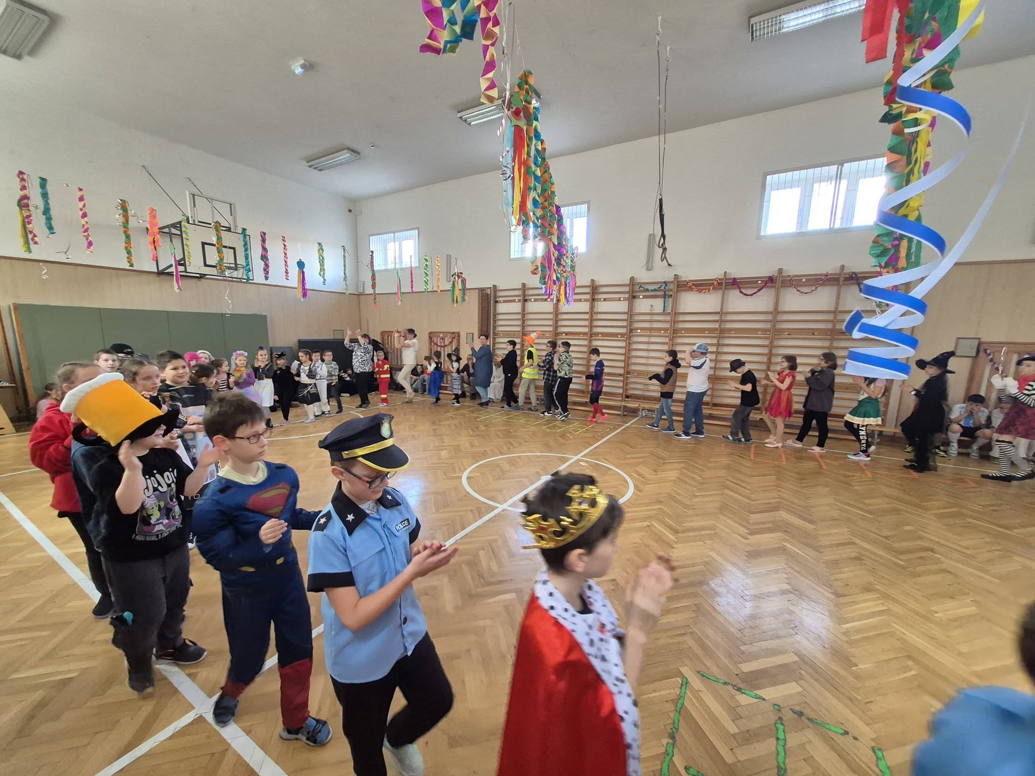 A gyerekek már reggel jelmezbe öltözve érkeztek, így az iskola folyosóit, tantermeit színes, ötletes és kreatív maskarások töltötték meg.