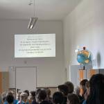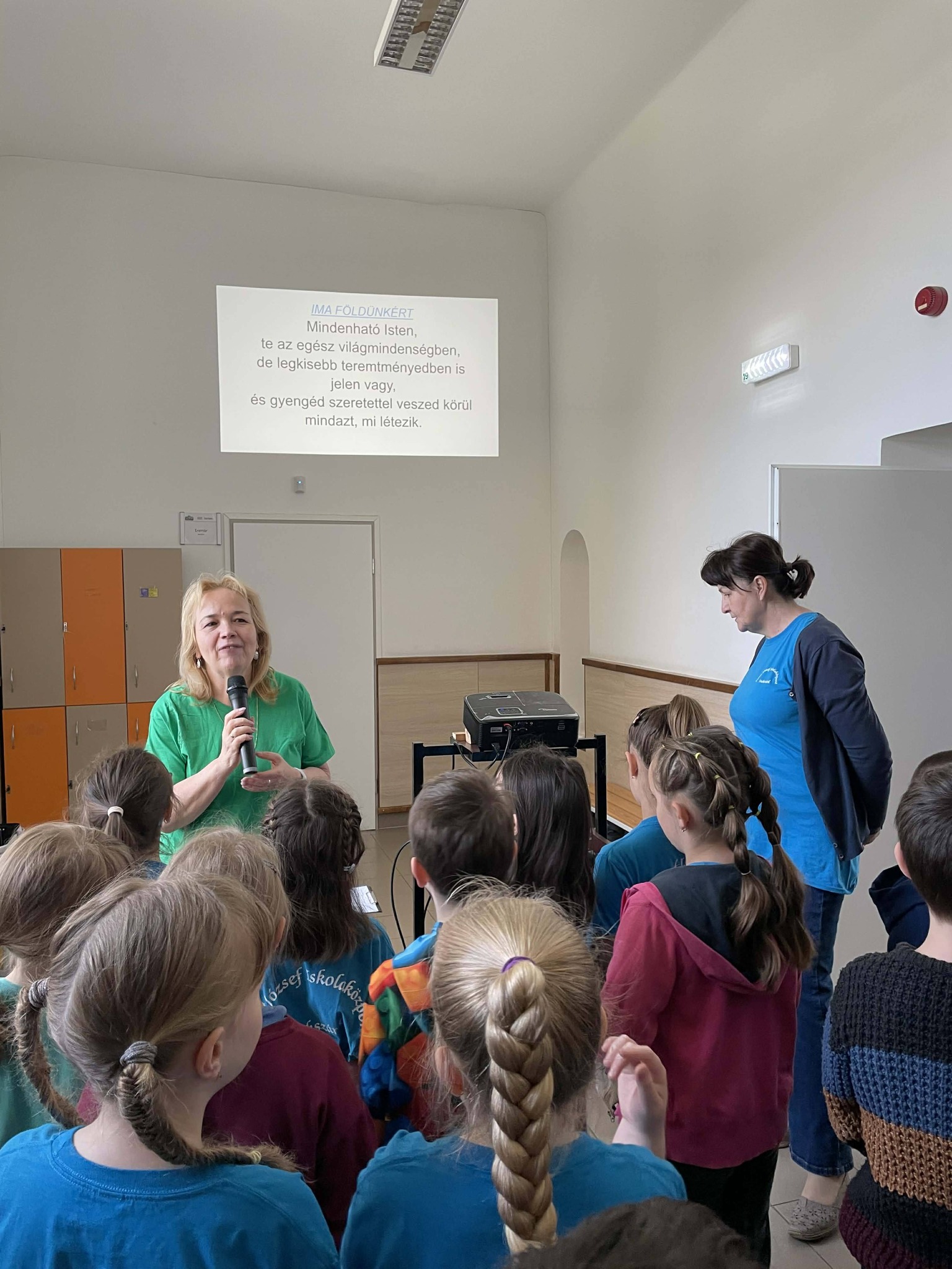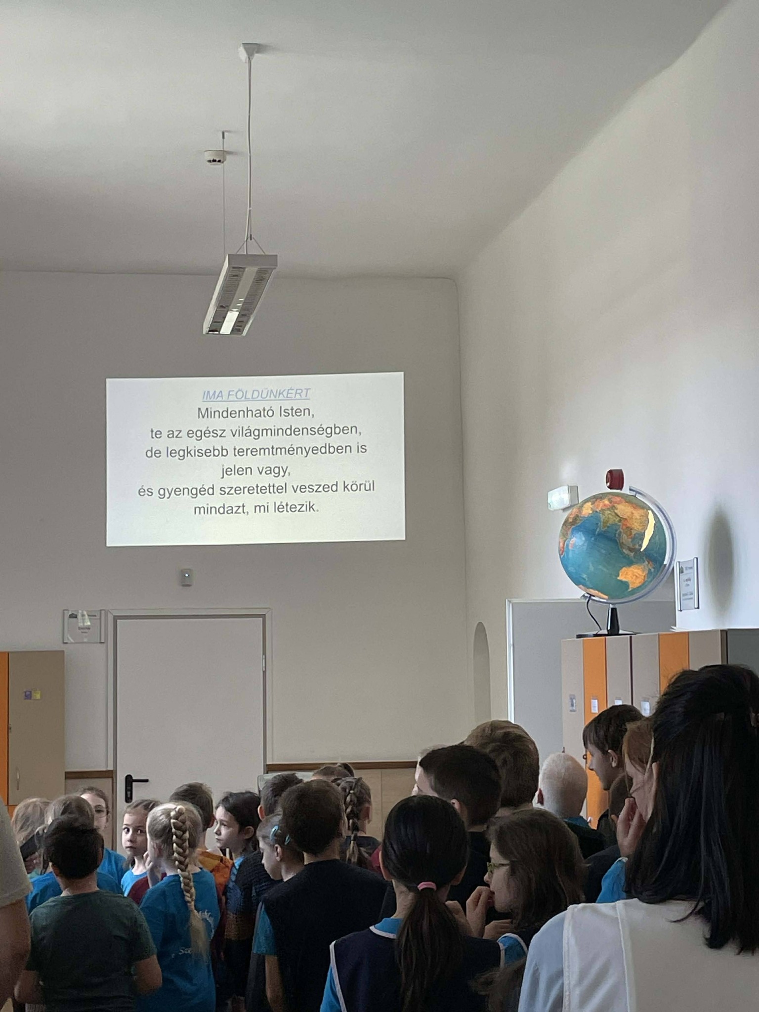 A nagyszünetben mindenki lejött az udvarra kék vagy zöld felsőben, és köröket alkotva a kékek jelképezték a tengereket, óceánokat, a zöldek pedig a szárazföldet.