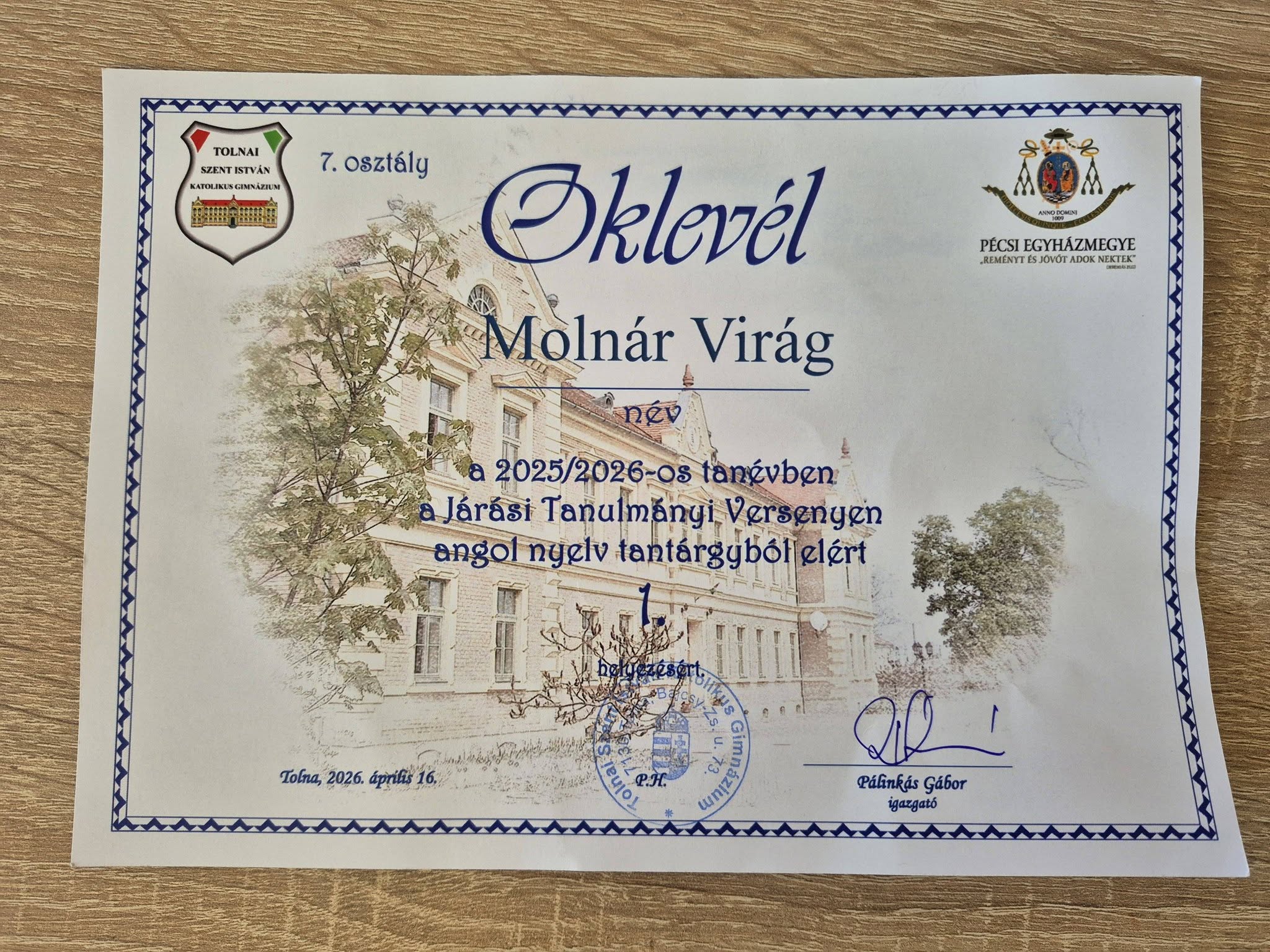Molnár Virág 7. osztályos tanulónk Tolnán a Járási Tanulmányi Versenyen angol nyelv tantárgyból 1. helyezést ért el.