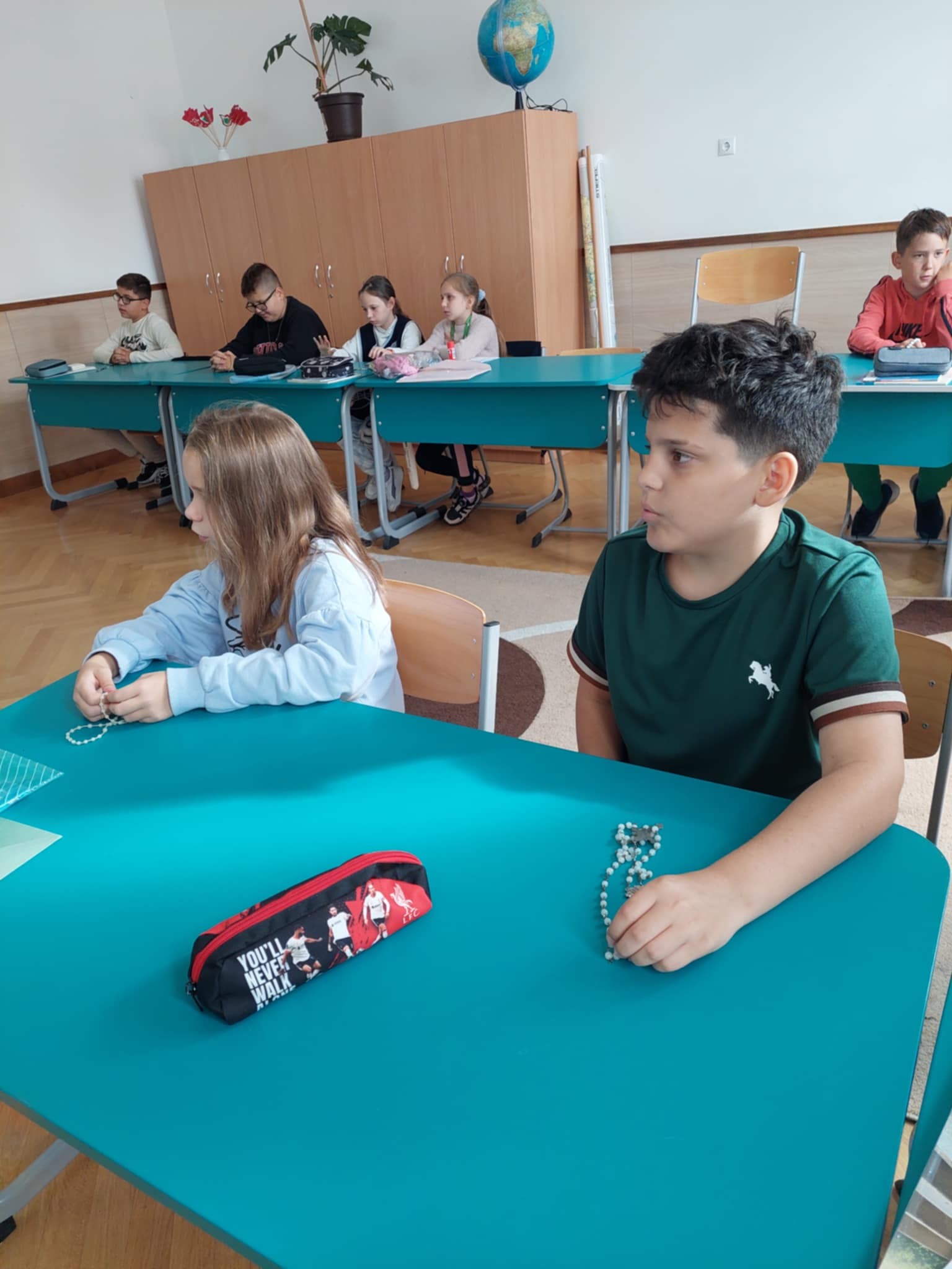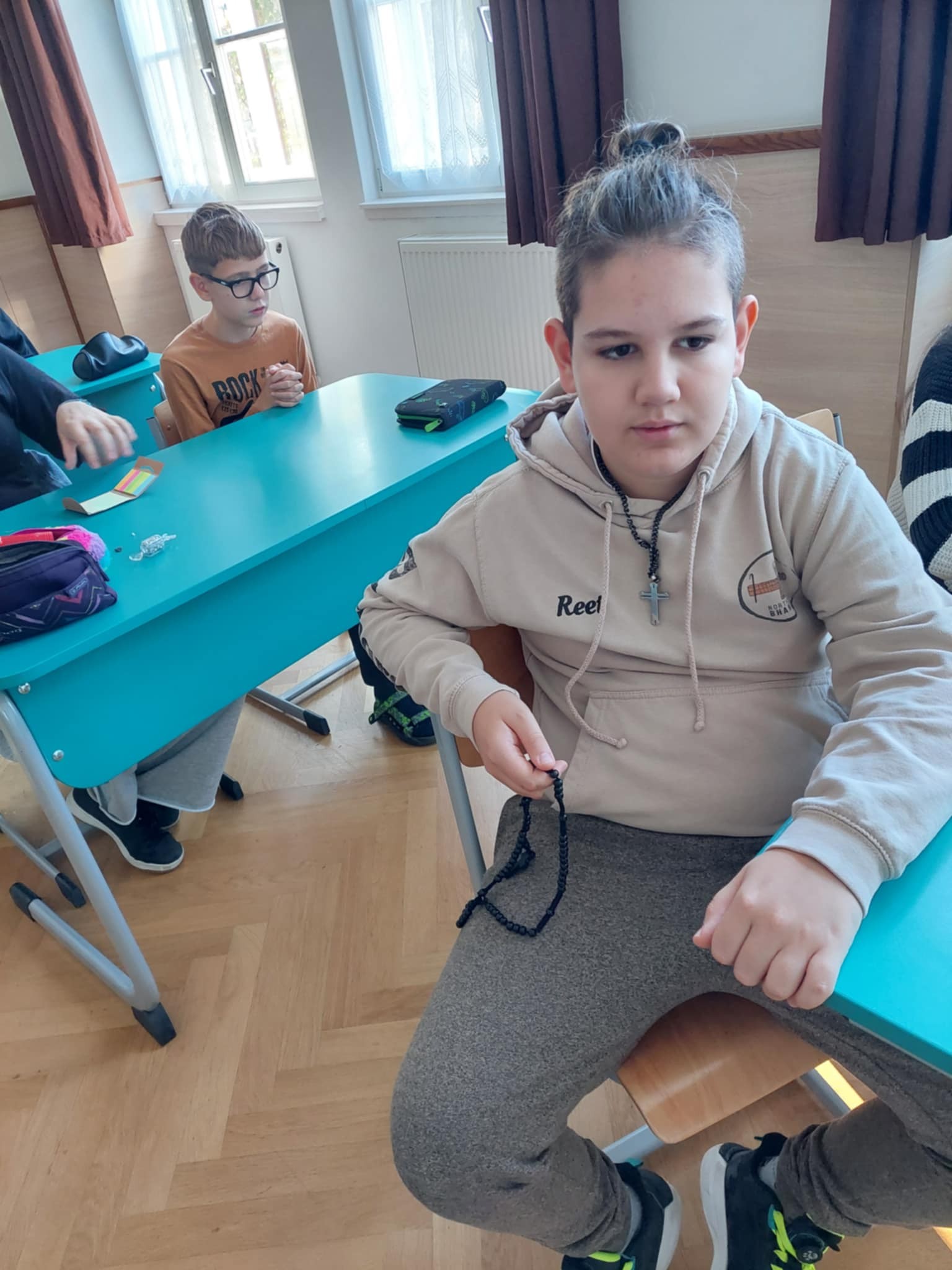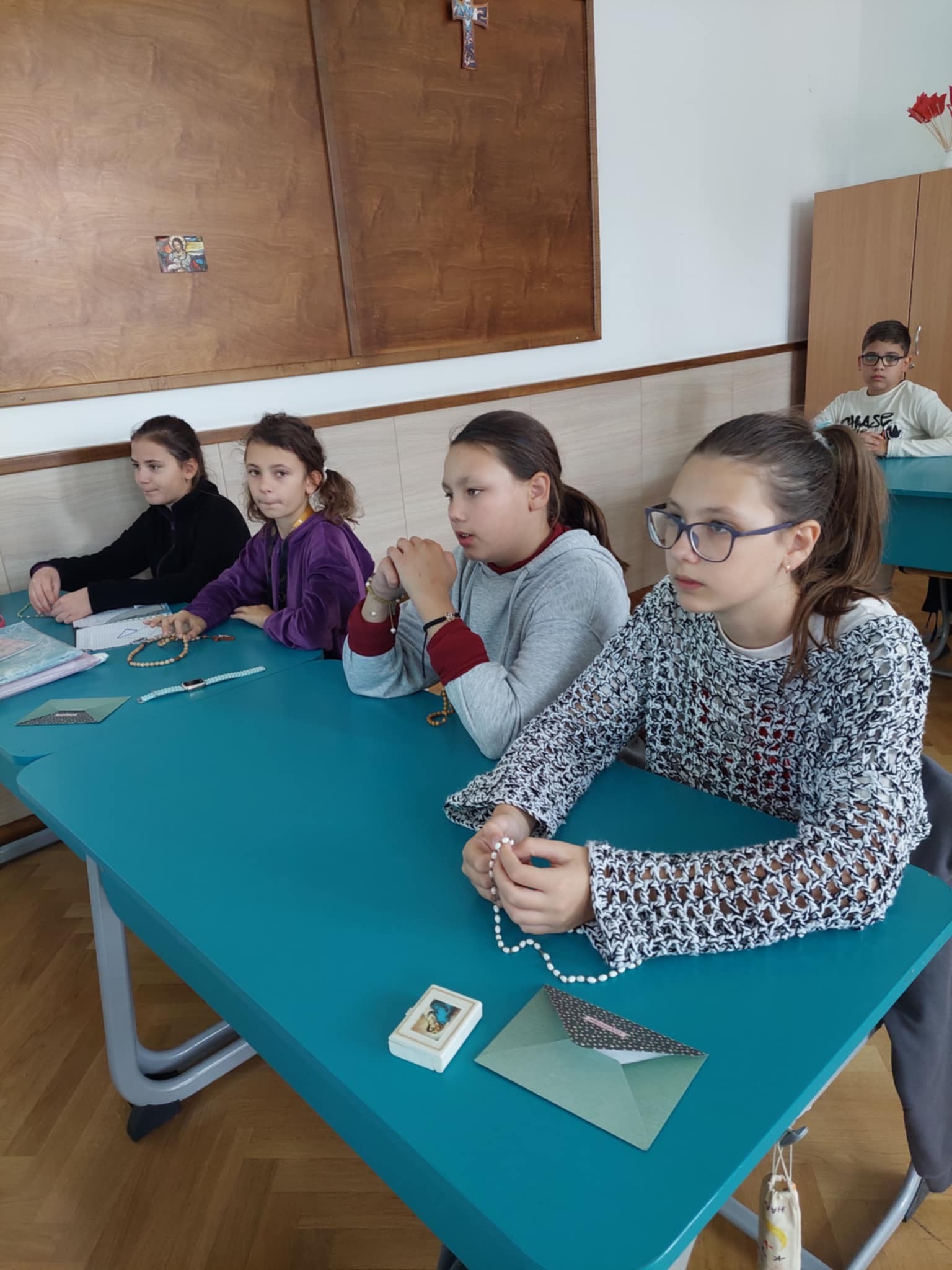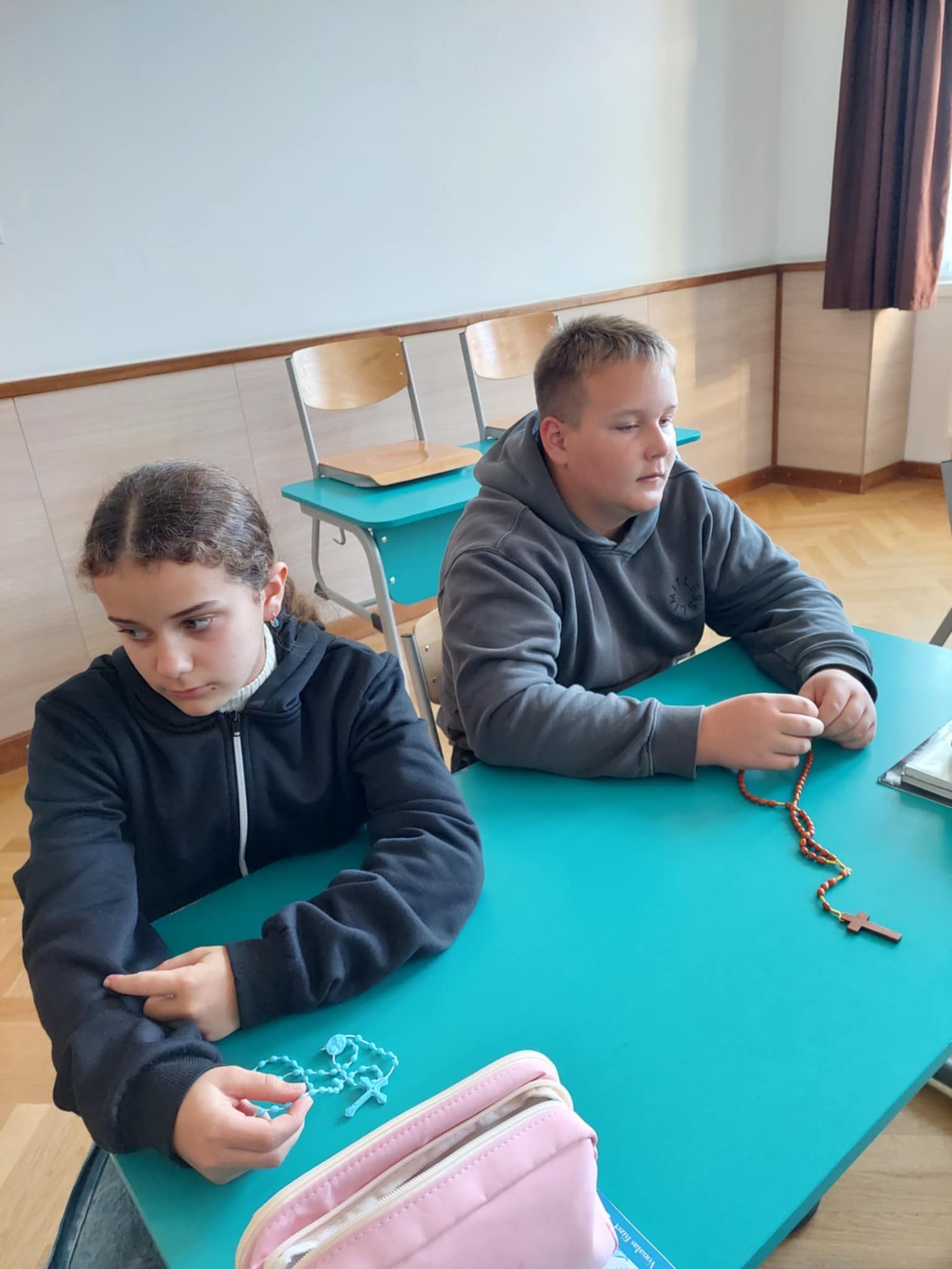 Október 7-én, Rózsafűzér Királynője ünnepén az ötödik és hatodik osztályosokkal hittan órán imádkoztuk a Dicsőséges titkokat a békéért és az egységért.