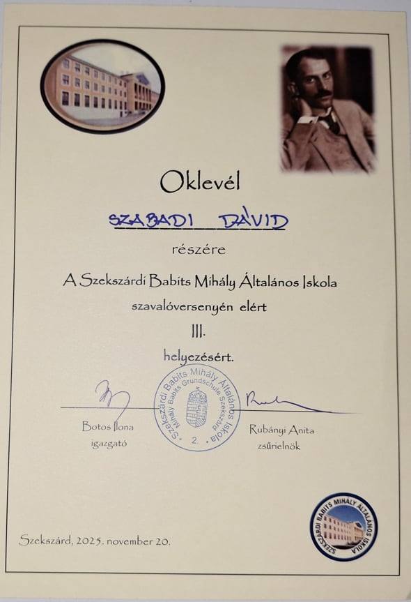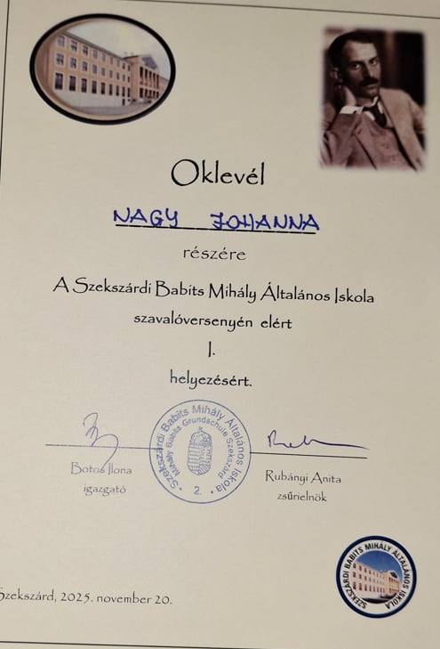 November 20-án Szekszárdon versmondó versenyt rendeztek a Babits Mihály Általános Iskolában az 5-8. osztályosoknak, melyen diákjaink szép sikert értek el.