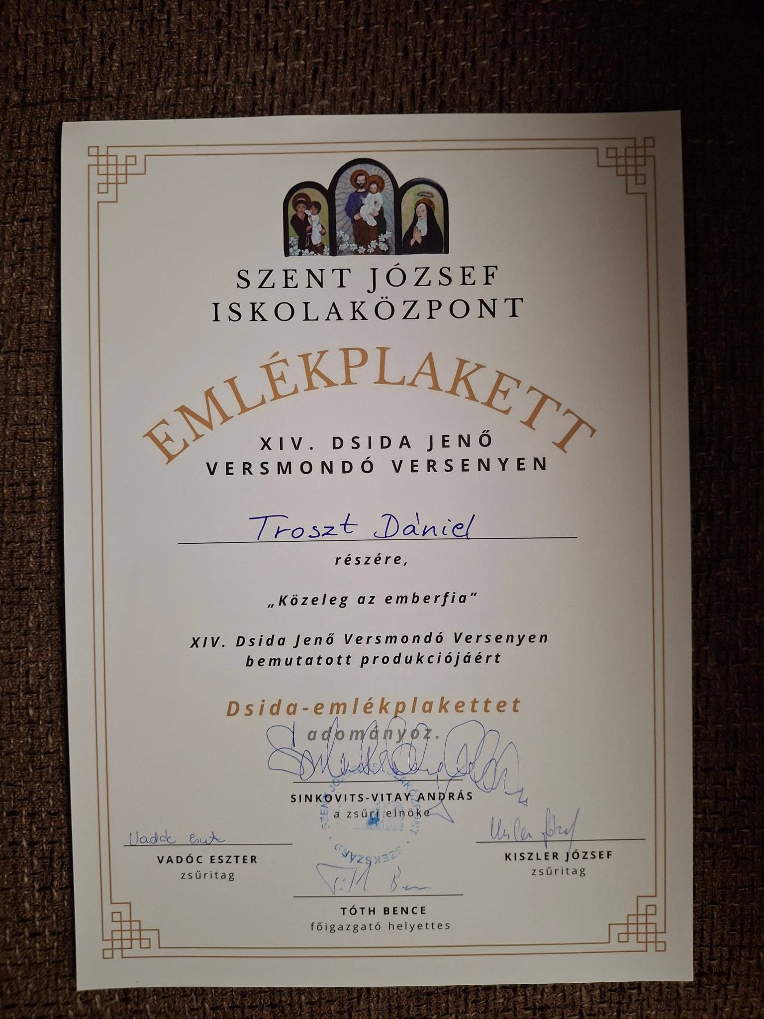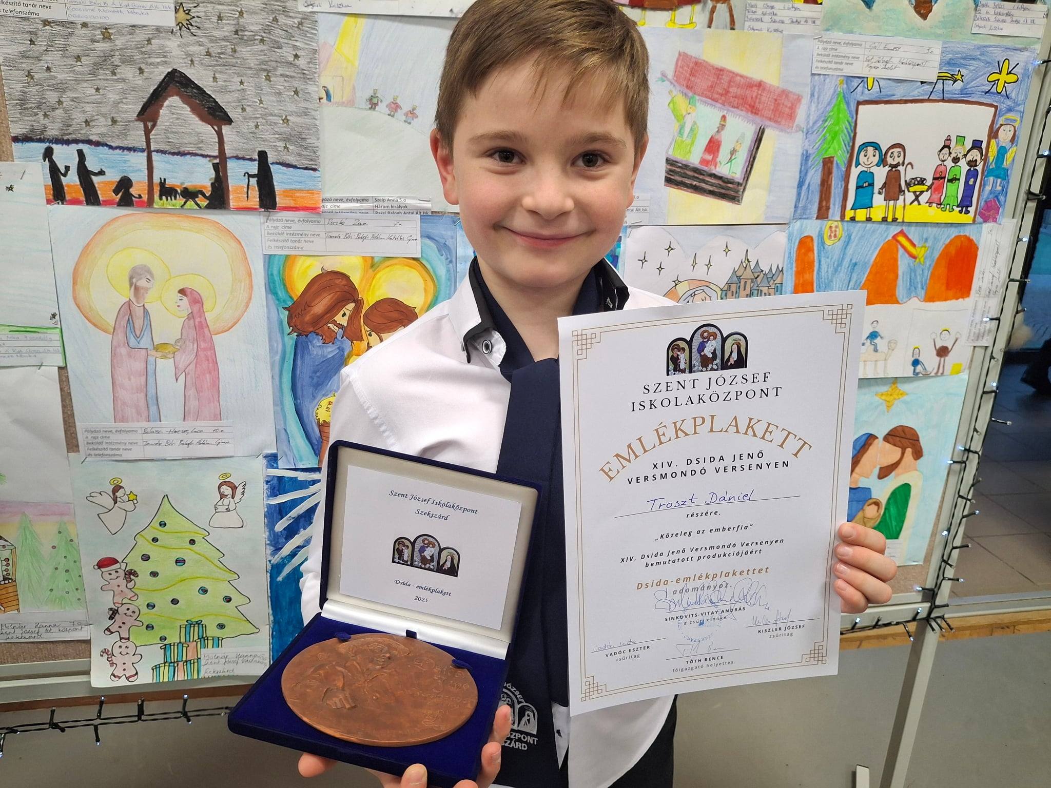 A legígéretesebb tehetségeknek járó Dsida Jenő-emlékplakettet az alsósok közül Troszt Dániel (Szent József Iskolaközpont, Szekszárd), a felsősök közül pedig Márkus Dominik (Komlói Kodály Zoltán Ének-Zenei Katolikus Általános Iskola) érdemelte ki.