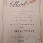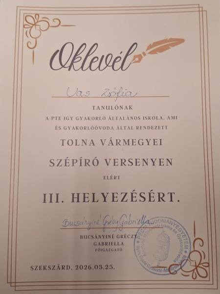 as Zsófia 7.osztályos tanulónk a Gyakorló Általános Iskolában rendezett Szépíró versenyen 3.helyezést ért el.