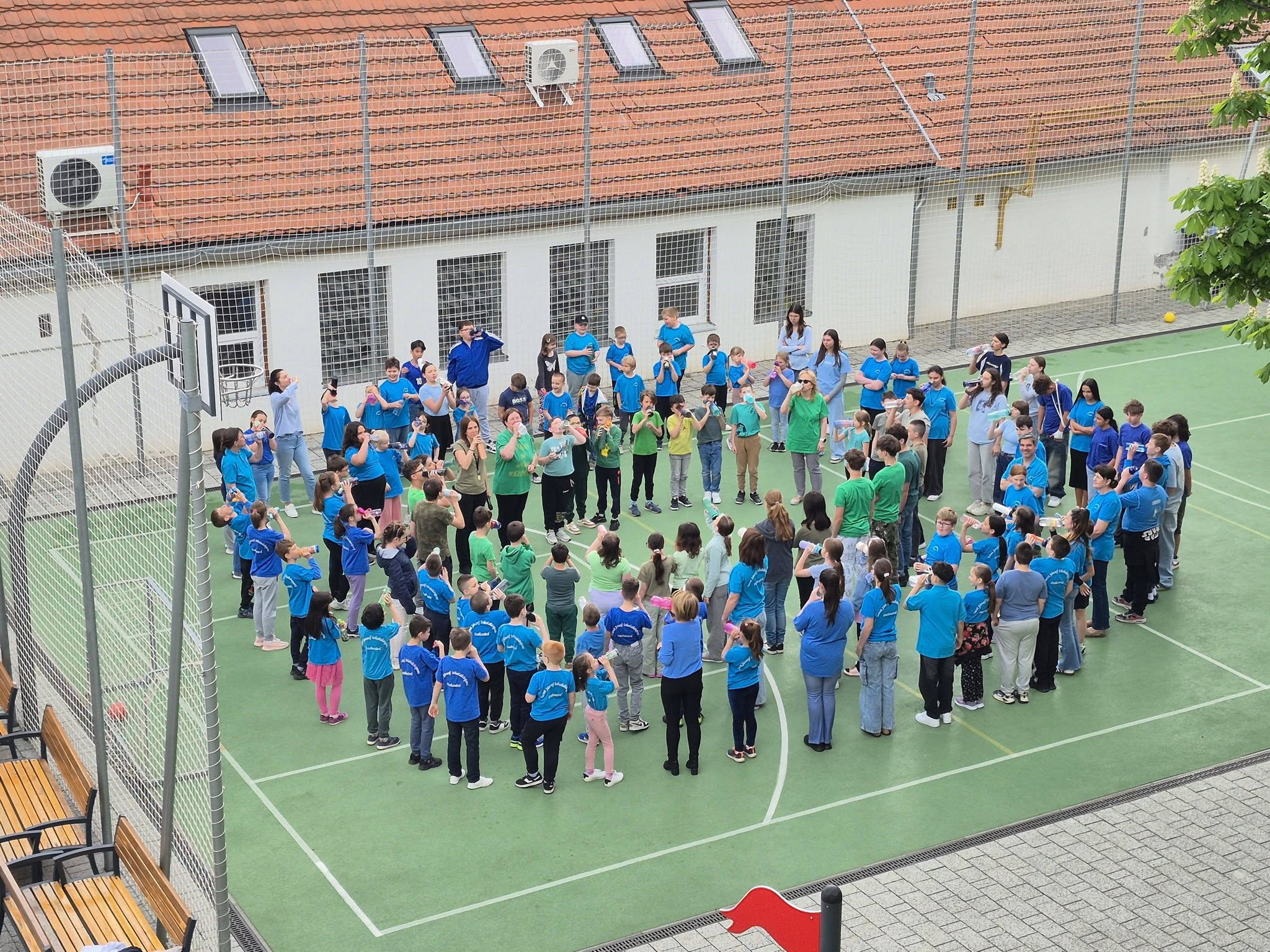 A nagyszünetben mindenki lejött az udvarra kék vagy zöld felsőben, és köröket alkotva a kékek jelképezték a tengereket, óceánokat, a zöldek pedig a szárazföldet.