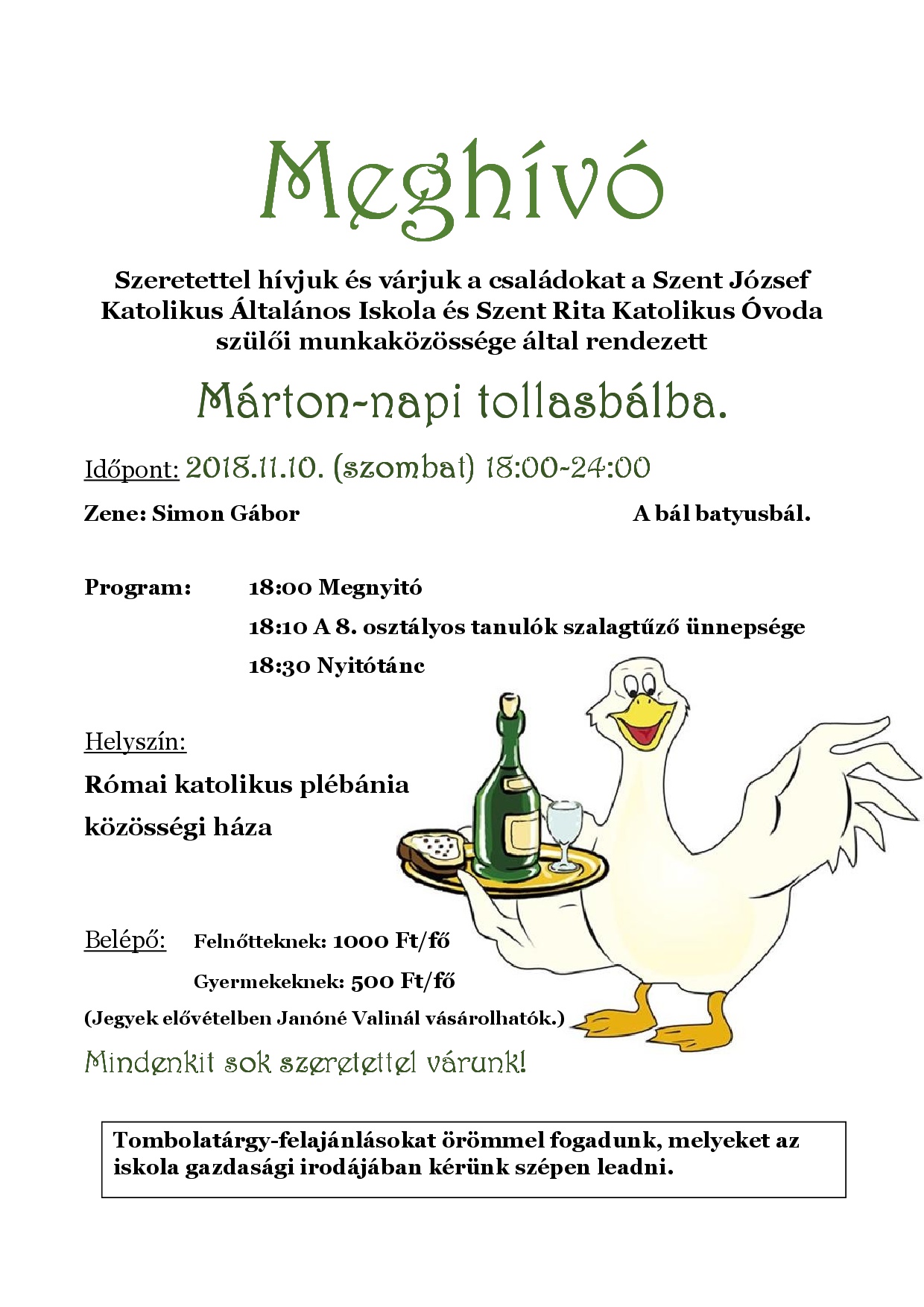 Szeretettel hívjuk és várjuk a családokat a Szent József Katolikus Általános Iskola és Szent Rita Katolikus Óvoda szülői munkaközössége által rendezett Márton-napi tollasbálba.