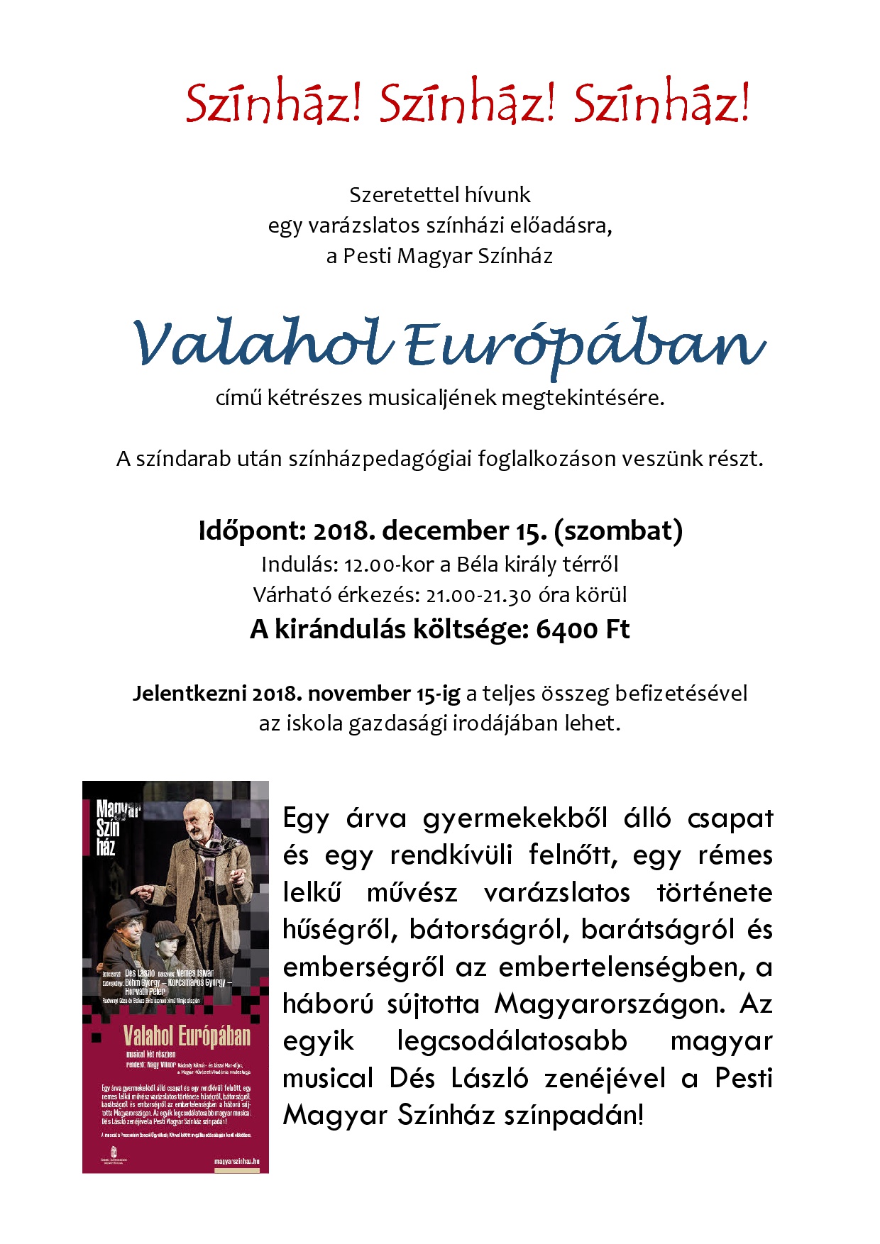 Szeretettel hívunk egy varázslatos színházi előadásra, a Pesti Magyar Színház Valahol Európában című kétrészes musicaljének megtekintésére.