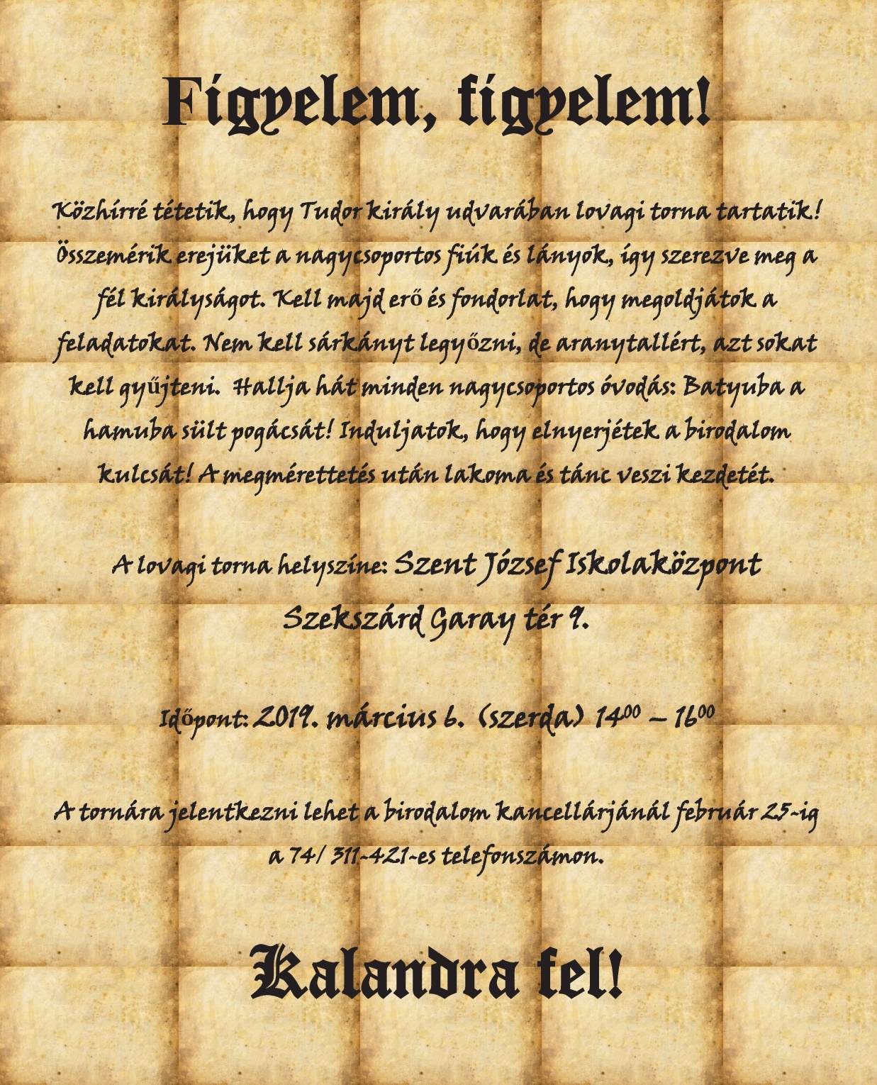 Szeretettel várjuk lovagi tornánkra óvónénijeikkel együtt a város és a városkörnyék minden nagycsoportos ÓVODÁSÁT, ÓVODÁS CSOPORTJAIT!