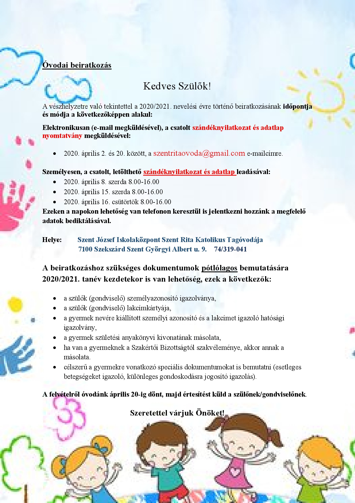 Értesítjük a Tisztelt Szülőket, hogy a vészhelyzetre való tekintettel a 2020/2021. nevelési évre történő beiratkozásnak időpontja és módja a következőképpen alakul.