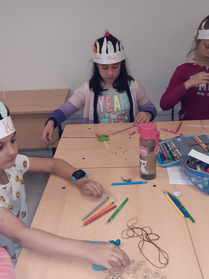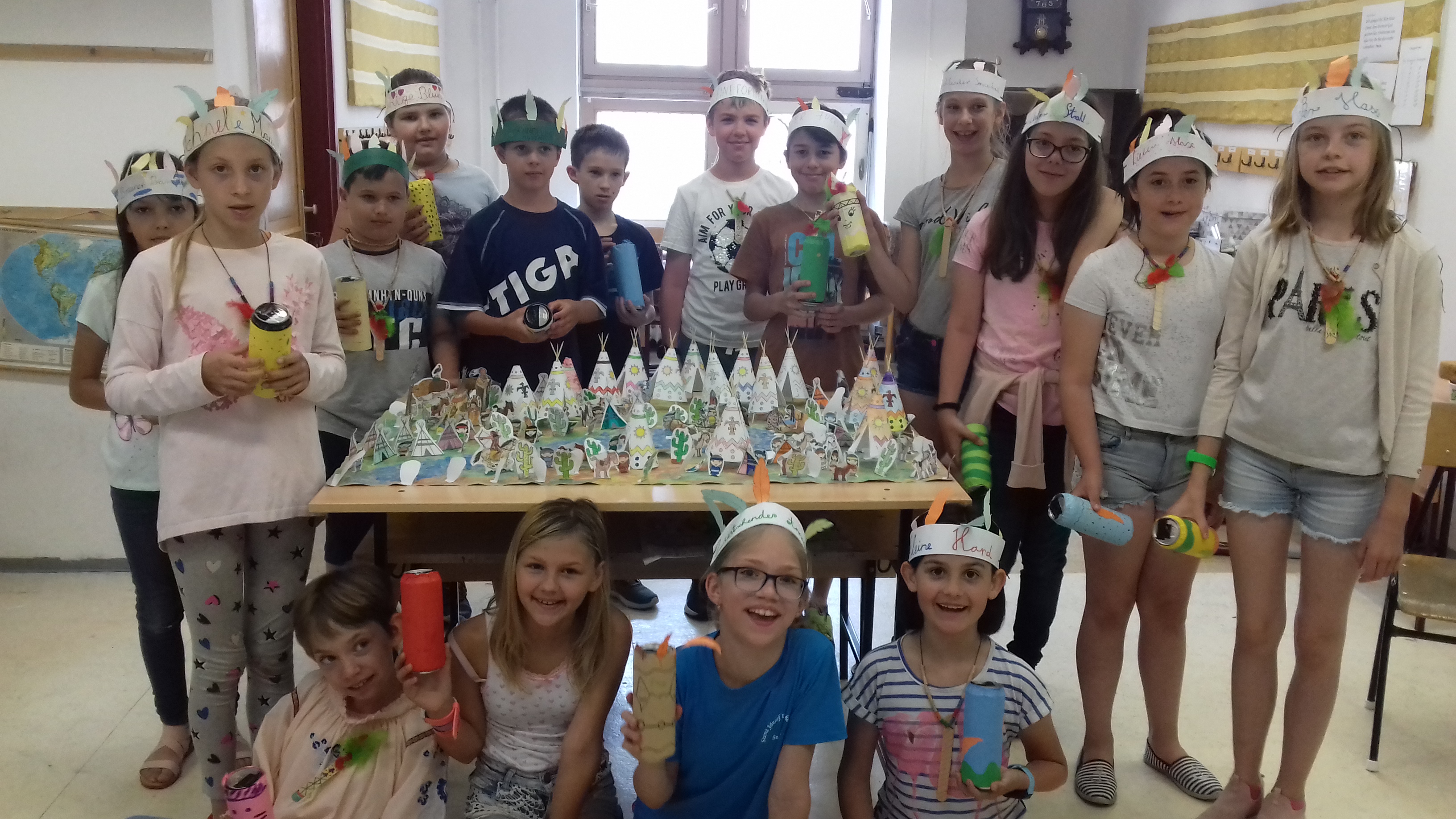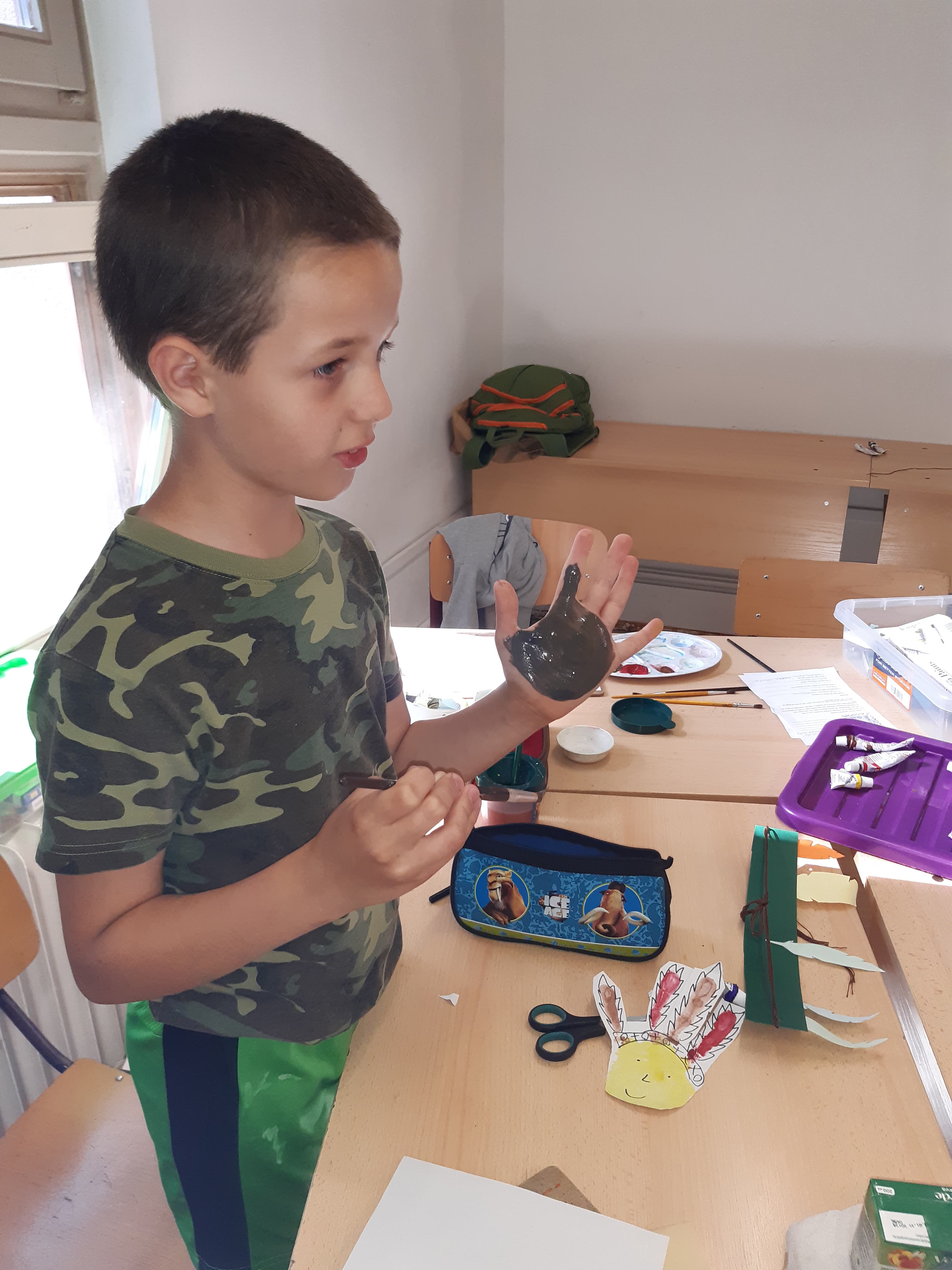 A napközis táborban délelőtt német nyelvű programok voltak. A programok és a nyelvi játékok tematikája az indián népcsoporttal kapcsolatos ismeretek, érdekességek köré épült, felhasználva az első három tanév során szerzett nyelvi ismereteket. A tartalmak egymásra épültek, amely egy ívet adott a témának a hét során. Változatos és élményszerű játékokon, kézműves tevékenységeken keresztül mélyedtünk el az indiánok világában, bővítették a gyerekek szókincsüket. Örömet jelentett számunkra, hogy a tanultakat később ő maguk is használták. A nyelvi kommunikációt segítette a DBU Piroska és a farkas című meséjének interaktív előadása, amelyet a gyerekek nagyon élveztek, és örültek, hogy több szót, kifejezést is ők mondhattak az előadás során. Az előadás megvalósulását az iskola vezetősége segítette, támogatta, amelyet ezúton is köszönünk.
