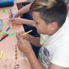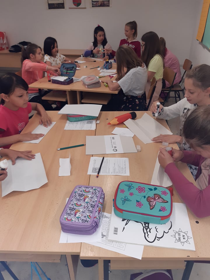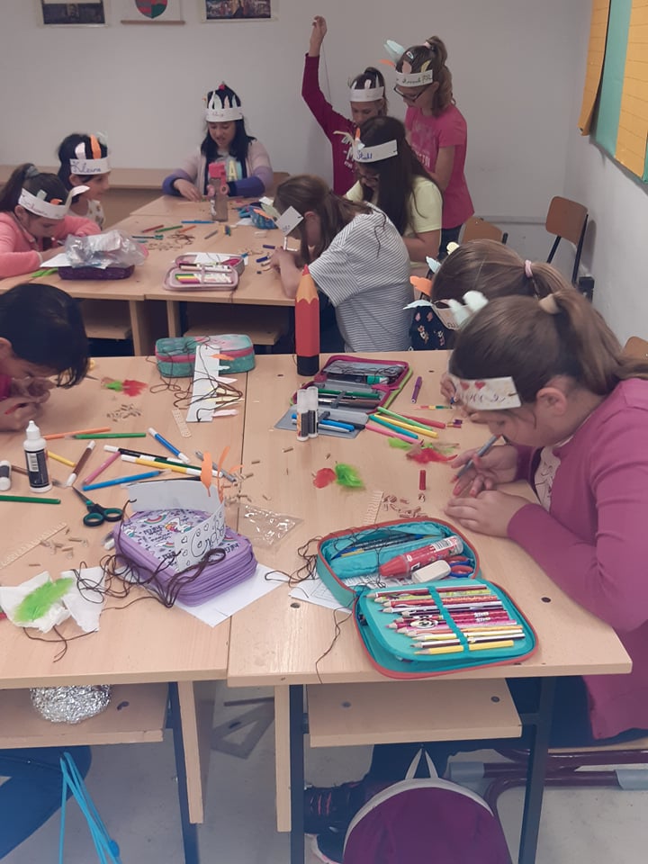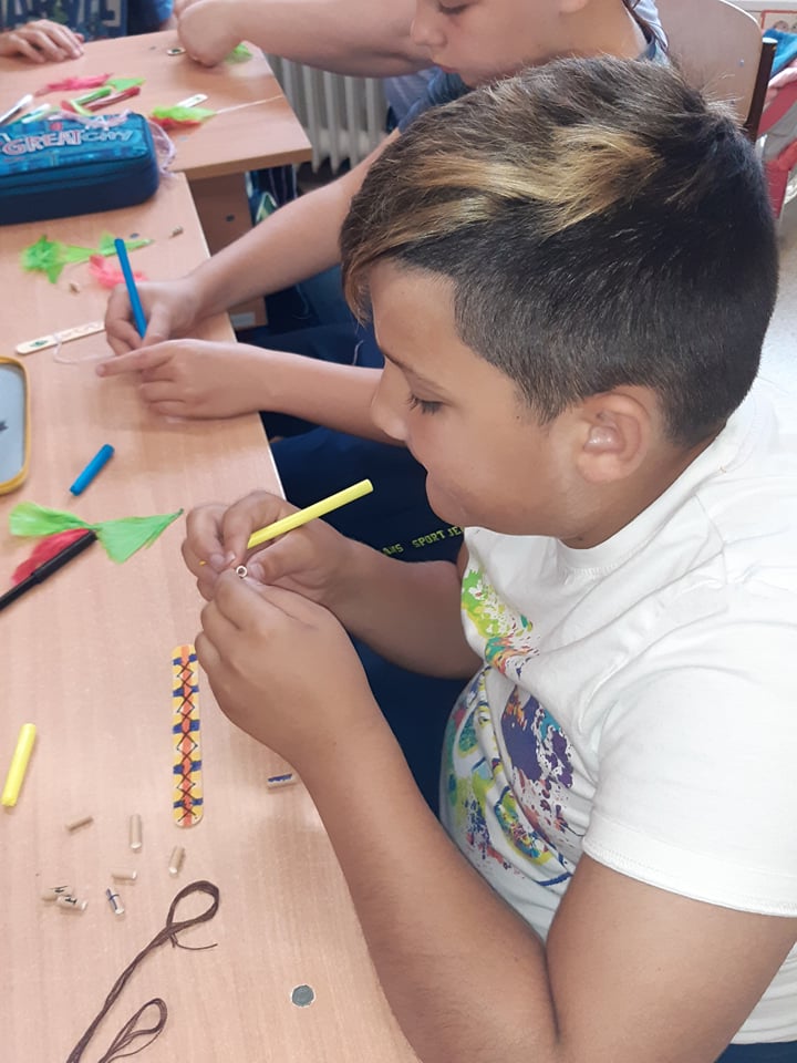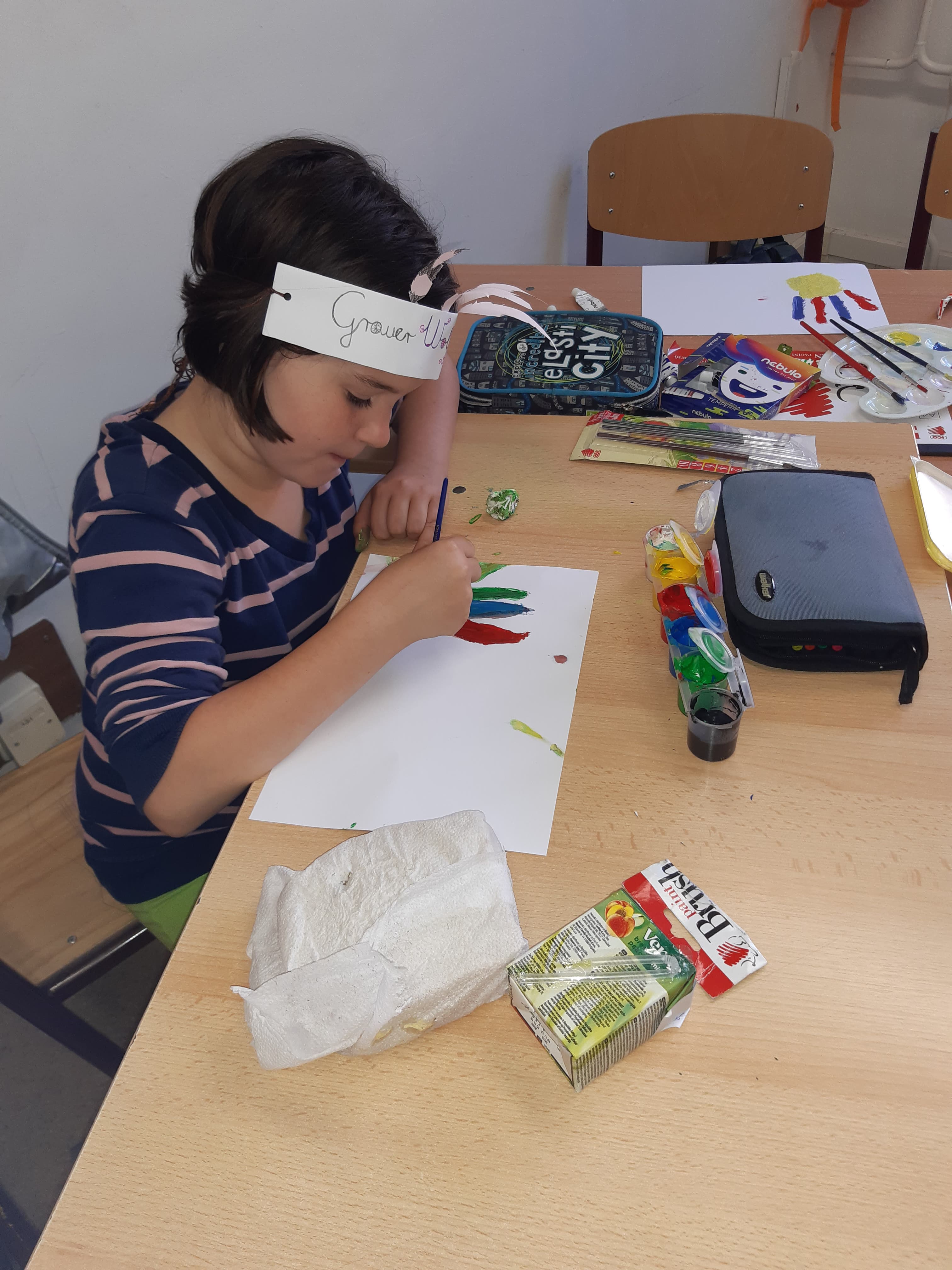 A napközis táborban délelőtt német nyelvű programok voltak. A programok és a nyelvi játékok tematikája az indián népcsoporttal kapcsolatos ismeretek, érdekességek köré épült, felhasználva az első három tanév során szerzett nyelvi ismereteket. A tartalmak egymásra épültek, amely egy ívet adott a témának a hét során. Változatos és élményszerű játékokon, kézműves tevékenységeken keresztül mélyedtünk el az indiánok világában, bővítették a gyerekek szókincsüket. Örömet jelentett számunkra, hogy a tanultakat később ő maguk is használták. A nyelvi kommunikációt segítette a DBU Piroska és a farkas című meséjének interaktív előadása, amelyet a gyerekek nagyon élveztek, és örültek, hogy több szót, kifejezést is ők mondhattak az előadás során. Az előadás megvalósulását az iskola vezetősége segítette, támogatta, amelyet ezúton is köszönünk.