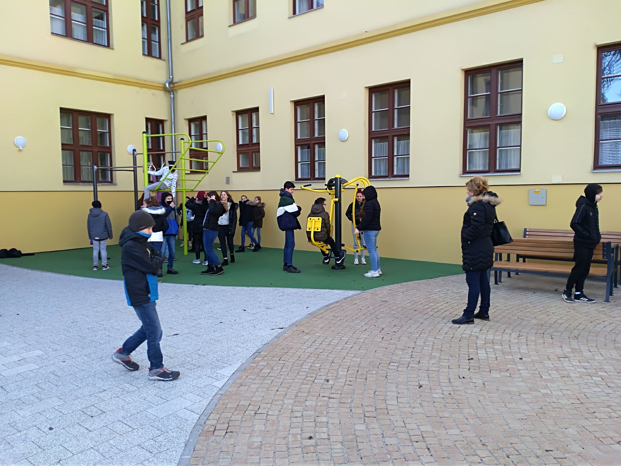 Az érdeklődő gyerekeknek az iskolabejárás után a tanítónők udvari játékot szerveztek, kapcsolatépítő játékokat játszottak koordinációs ernyővel, majd a nagycsoportosok örömmel vették birtokba az új játszóteret. Öröm volt látni szemükben a meglepettséget, vidámságot, mindent ki akartak próbálni, a csúszdát, a felsősök edzőgépeit, a mászókát, a sportudvart, azt sem tudták, hova szaladjanak először.