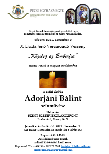 A szavalni szerető diákokat szeretettel hívjuk adventi versmondó versenyünkre, amelynek fényét emeli, hogy zsűri elnökünk Adorjáni Bálint lesz december 9-én.
