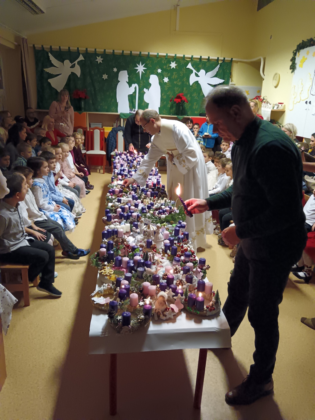 Miklovics Attila Káplán atya,Petkó Tamás atya és Koósz Roland Pécsi Egyházmegye Oktatási vezetője gyújtotta meg az első lila gyertyát az Adventi koszorúkon.