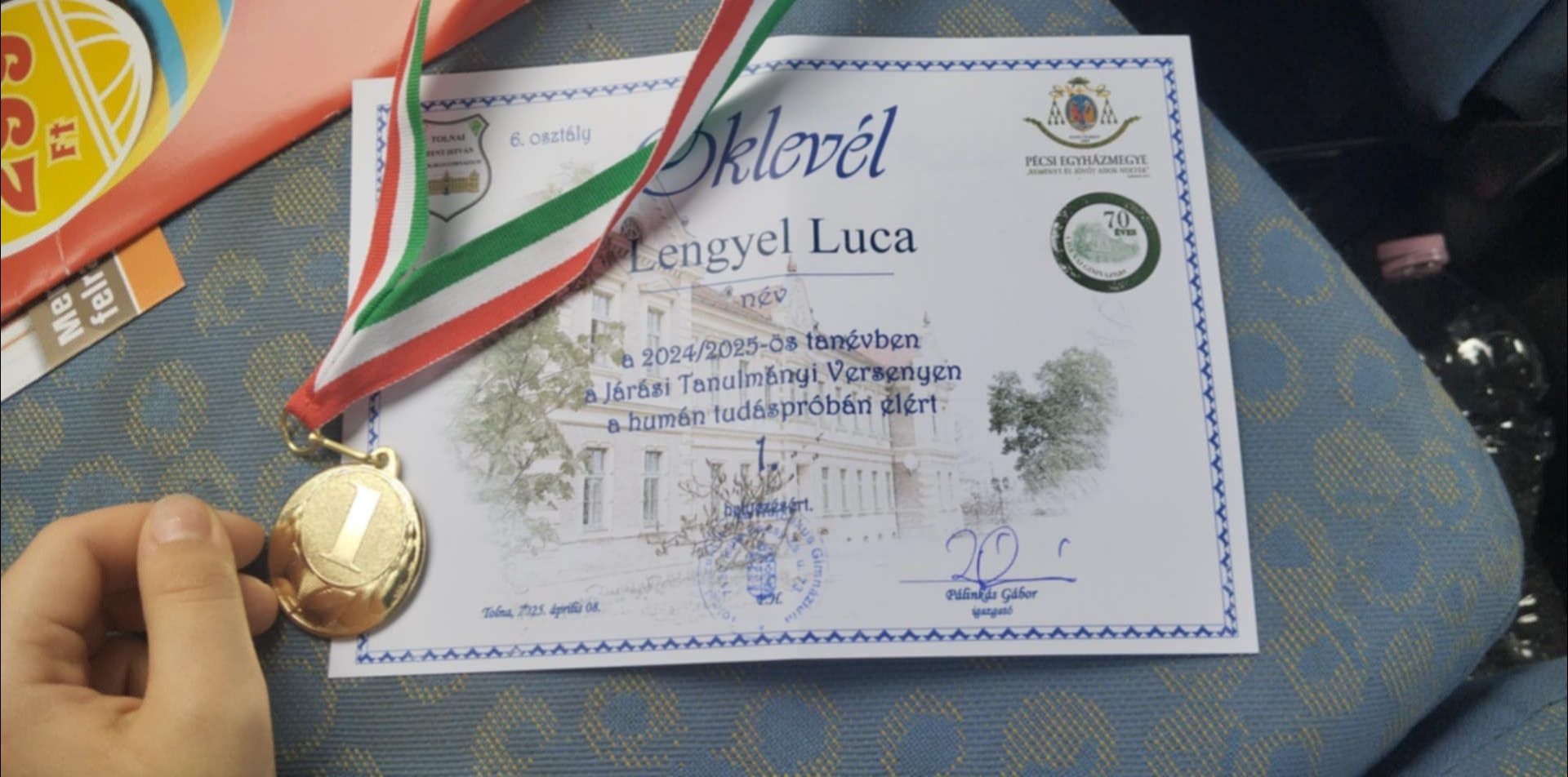 Lengyel Luca 1. helyezést ért el a Tolnai Szent István Katolikus Gimnáziumban rendezett Járási Tanulmányi Versenyén, a Humán Tudáspróbán.