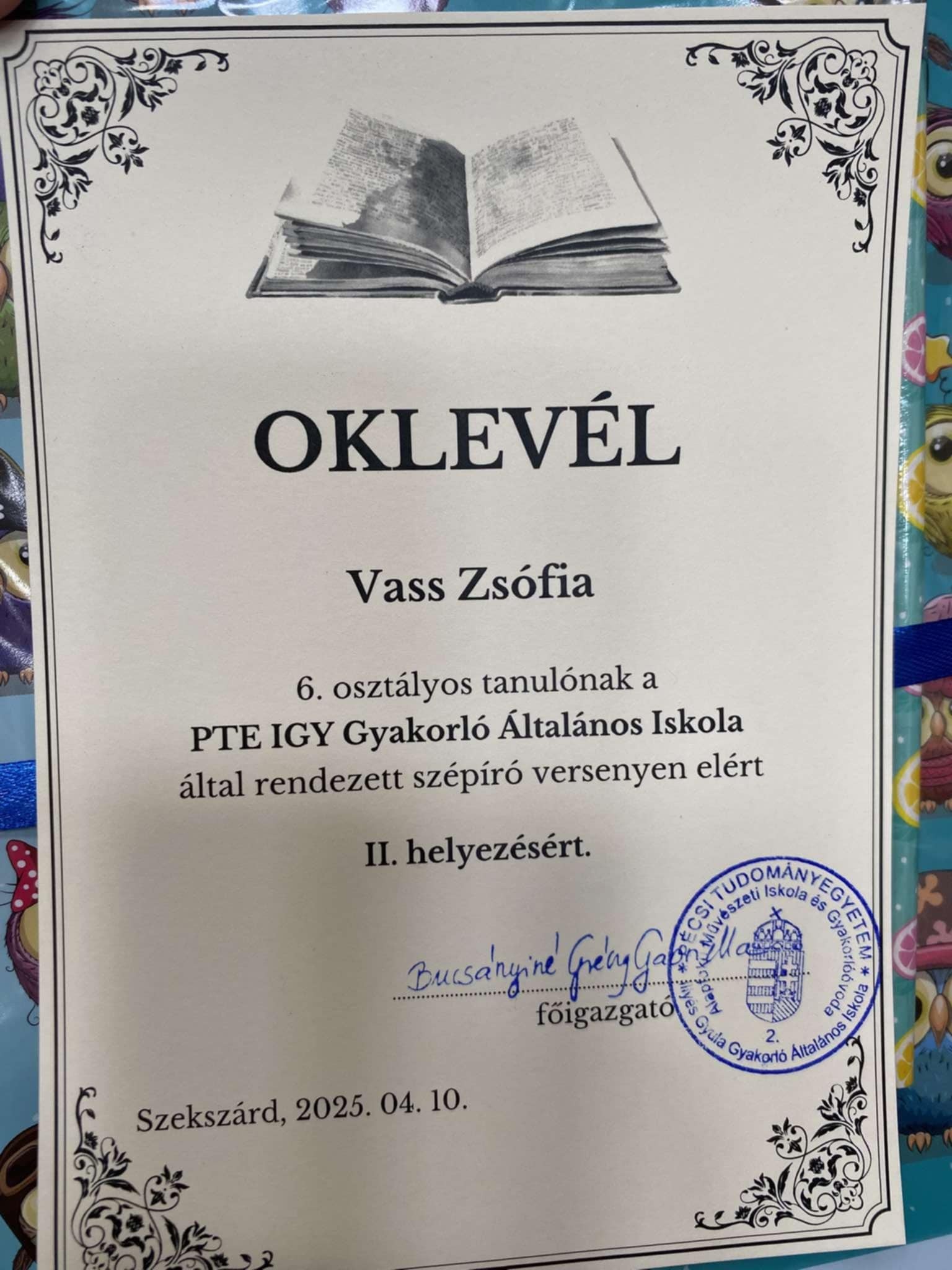 Vas Zsófia 2. helyezést ért el a 6. osztályos korcsoportban.