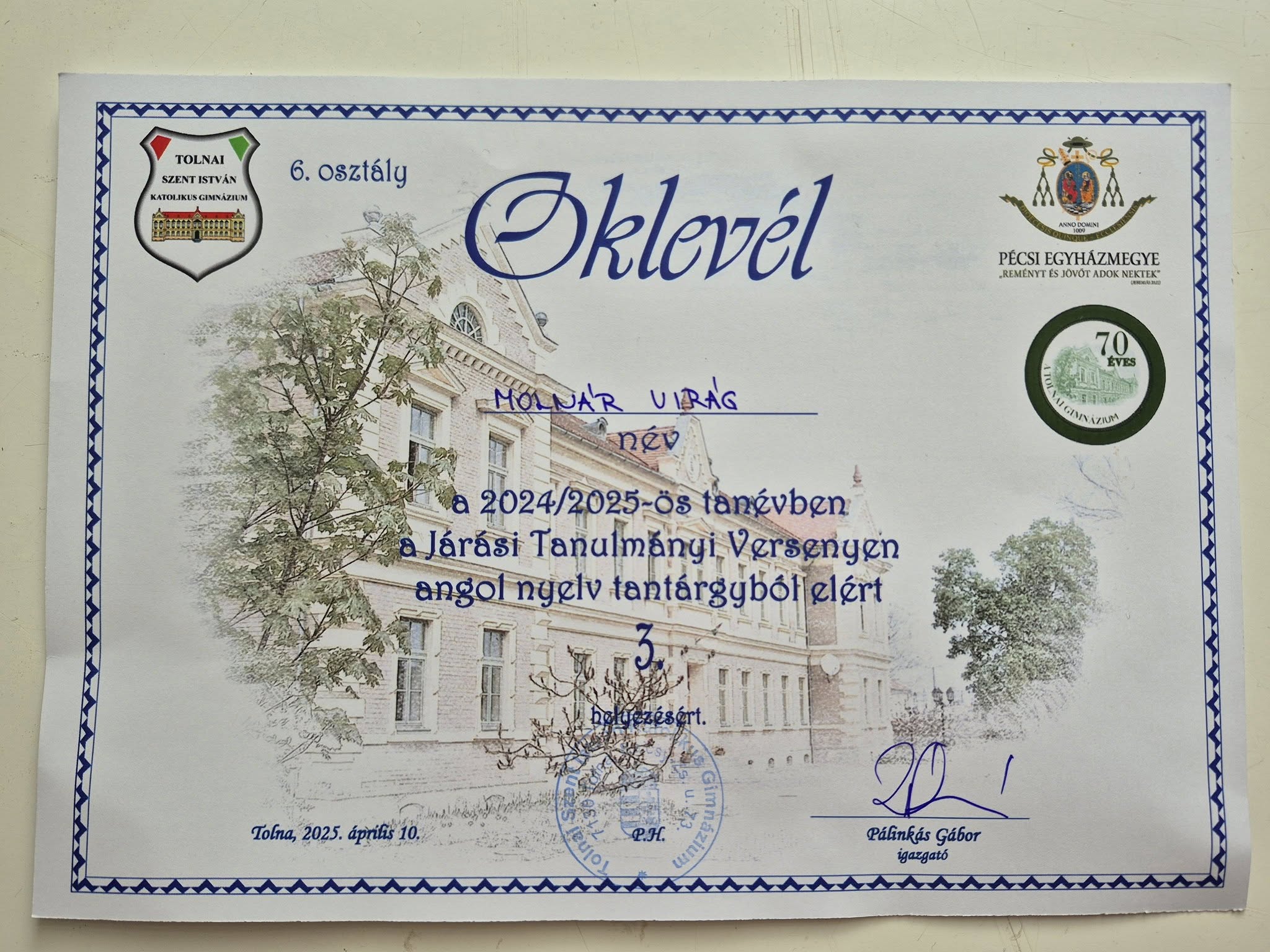 Molnár Virág hatodik osztályos tanulónk 3. helyezést ért el a Járási Tanulmányi Versenyen angol nyelv tantárgyból.